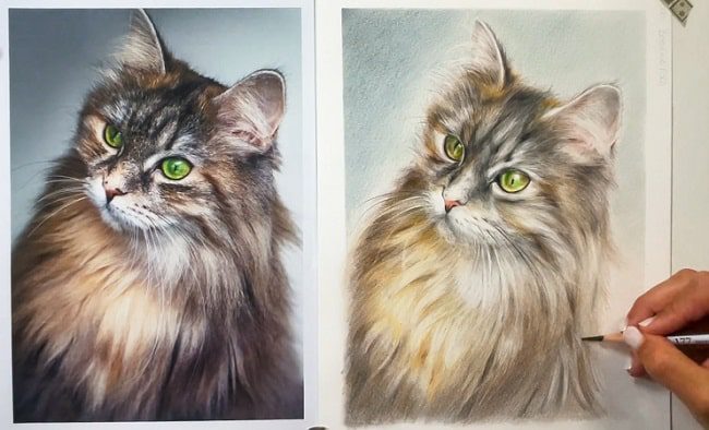 Corso dedicato alla realizzazione di un gatto peloso, interamente colorato con le matite colorate a partire da una reference fotografica.